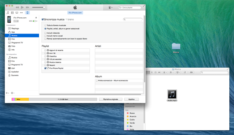 Se la tua libreria iTunes conta solo pochi brani e su iPhone non hai problemi di spazio, sincronizzare tutta la musica su iPhone con iTunes è un gioco da ragazzi: apri iTunes, colleghi l’iPhone al computer, vai su musica e sincronizzi tutto.